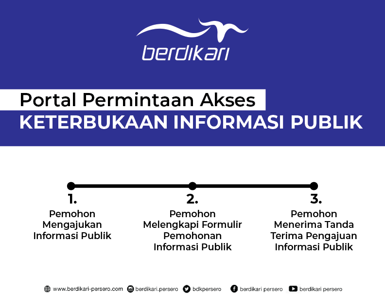 Masyarakat dapat mengajukan permohonan informasi kepada PT Berdikari (Persero) dan PT Berdikari (Persero) wajib memenuhi permohonan tersebut selama tidak termasuk informasi yang dikecualikan dan/atau tidak memiliki dampak merugikan menurut uji konsekuensi. Permohonan informasi tersebut dapat dilakukan melalui mekanisme pengisian formulir pengajuan informasi publik. Formulir Permohonan Informasi Publik dapat diunduh disini.